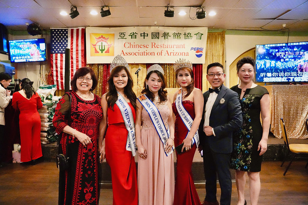 此外,本屆晚宴還邀請了2026鳳凰城華裔才藝小姐們上台致辭,與Mrs.越南選美得獎者及在場政府官員共同合影留念,增添了慶典的喜慶氣氛。